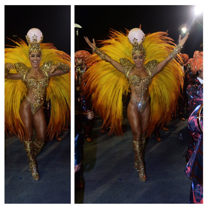 à frente da bateria da Vila Isabel, no último dia de desfiles no Rio de Janeiro. Ousada, exibiu seu corpo super em forma numa fantasia de metal dourada, feita por Henrique Filho. Costeiro azul, coroa, braceletes, espada e bota até os joelhos completaram o look. Na madrugada de sexta-feira para sábado, a apresentadora desfilou pela Gaviões da Fiel em São Paulo com look também dourado e costeiro amarelo, representado a luz.
